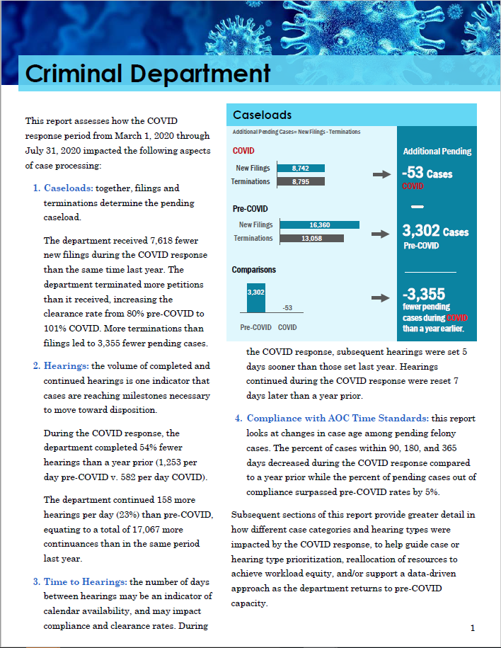 Targeted reports demonstrated the impact on caseloads, hearing completion, time to hearings, and compliance rates to identify strategies for tackling the backlog in each department.